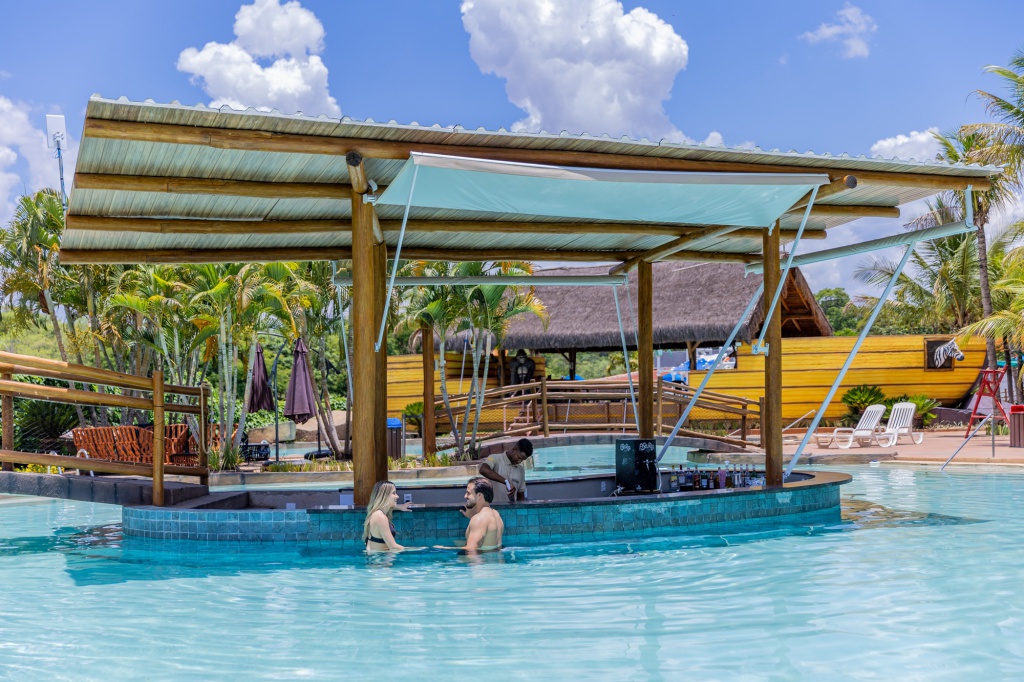 Localizado no coração da piscina adulta, na área Gênesis, o novo bar molhado chega com uma proposta única: oferecer um ambiente tropical, com decoração em palha e madeira, em formato de ilha. O espaço terá capacidade para até 20 clientes simultâneos, com bancos submersos, garantindo uma experiência refrescante e descontraída.