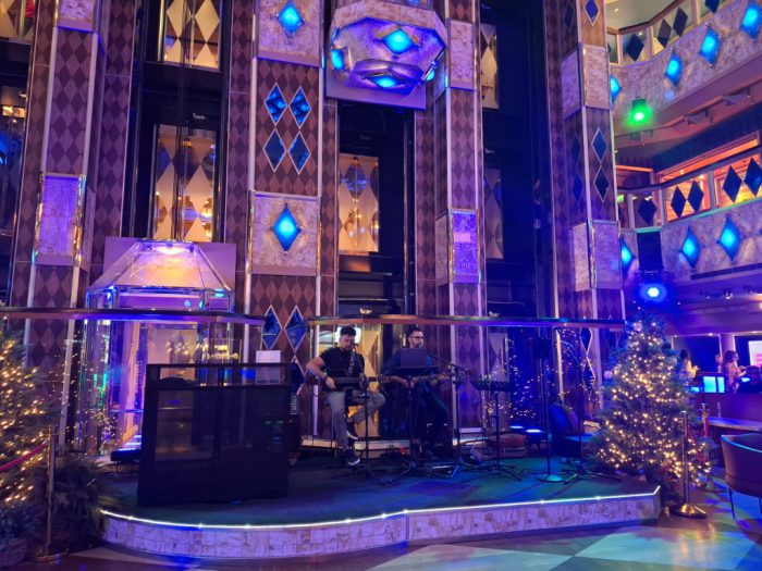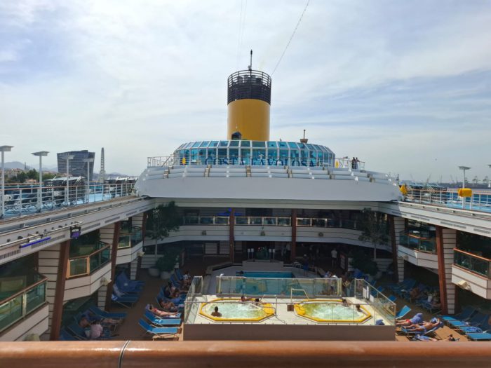 Brilhando sob luzes quentes, o átrio principal parece convidar os visitantes a se perderem por alguns minutos entre detalhes, texturas e reflexos. Nas áreas externas, o mar se mistura ao som leve da música e ao sorriso dos tripulantes, que dão o tom de hospitalidade que a Costa tanto preza.