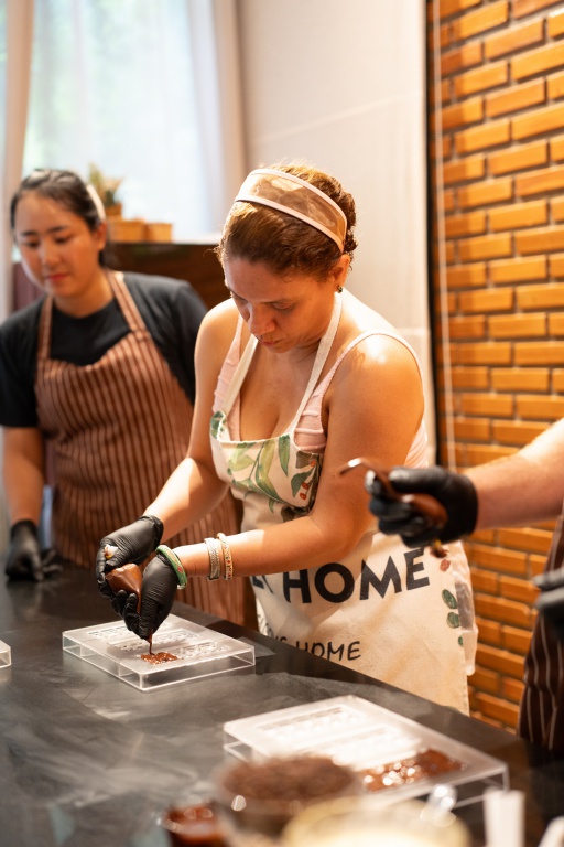 Os workshops de produção de chocolate são momentos de descoberta. Em duas horas, os participantes aprendem a selecionar, moer e moldar o cacau, transformando grãos em barras artesanais. O cheiro adocicado que toma conta do ambiente, o brilho do chocolate sendo temperado e o prazer de provar a própria criação tornam a experiência inesquecível. Para Thanawang, essas oficinas são também uma forma de educação: “As pessoas voltam para casa entendendo o valor do cacau, o trabalho por trás de cada pedaço de chocolate e a importância de consumir de forma consciente.”