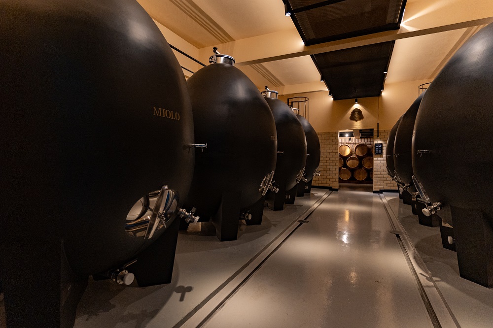 Os investimentos também chegaram ao interior da vinícola com a criação da Cave Giuseppe, projetada para receber os oito ovos de concreto utilizados na elaboração dos vinhos da linha Miolo Giuseppe, cada um com 2,70 m de altura e capacidade para 3.100 litros. O espaço recebeu tratamento cênico completo, com iluminação, revestimentos, passarelas de manutenção e integração direta com a sala de barricas, que agora funciona como sala de degustação do novo Tour Giuseppe Miolo, equipada com uma mesa central para 24 pessoas.